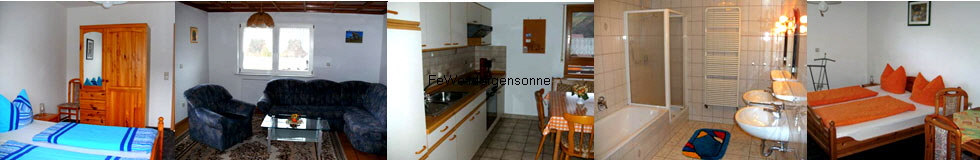 ist modern und behaglich eingerichtet, verfügt über 58m². Sie befindet sich in der 1. Etage, besteht aus einem Schlafzimmer mit Doppelbett, Wohnzimmer mit komfortabler Ausziehcouch, Sat TV und Hifi CD Player vorhanden. Die lichtdurchflutede Küche mit Essecke ist mit Spülmaschine, Backofen, Kühlschrank mit Gefrierfach, Mikrowelle, Toaster, Wasserkocher, doppeltem Geschirrsatz und Kafeemaschine ausgestattet. Das Bad mit Dusche, Waschtisch mit Unterschrank und WC verfügt über Handtücher, Föhn und Kosmetikspiegel. In der Ferienwohnung ist W-lan kostenlos. Telefon vorhanden. Eine aufschlussreiche Info Mape über die Region mit Tips für Tagesausflüge liegt in der Ferienwohnung für Sie bereit.